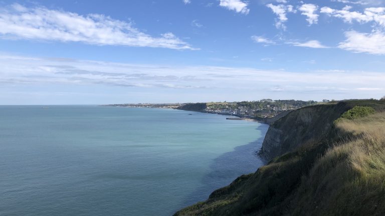 Om eerst orde op zaken te stellen, besluiten we een paar nachten in Normandië door te brengen. Na een nachtje in stormachtig Fécamp rijden we door naar Arromanches-les-Bains. Onze camperplaats heeft een fenomenaal uitzicht op invasiestrand Gold Beach. Het voelt raar om juist hier met een luxeprobleem als het herinrichten van camperkastjes bezig te zijn. In het stadje herinnert alles je aan 6 juni 1944, de dag dat de bevrijding van Europa begon. De overblijfselen van de Mulberry Harbour, de imposante Sherman tank en de onlangs geopende D-Day 75 Garden. We besluiten daarom om een bezoek te brengen aan de 360 graden Cinema. In de zaal worden rondom op negen schermen historische beelden getoond van de geallieerde invasie. Nog nooit zijn de verschrikkingen van de oorlog zo tastbaar als nu.
